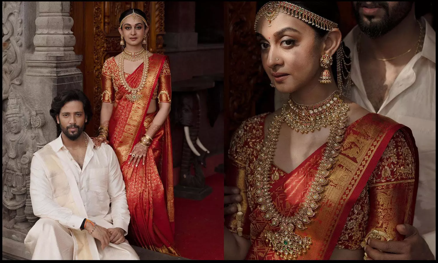 மகள்கள் எப்போதும் ஒவ்வொரு தந்தைக்கும் தேவதைகள் போன்றவர்கள்தான். அப்படி நடிகர் அர்ஜுனுக்கும் தனது இரண்டு மகள்களும் தேவதைகள்தான் என்றாலும், அவர் மிகவும் நேசிப்பது மூத்த மகளான ஐஸ்வர்யாவைத்தான். அப்படியொரு அழகு தேவதையான ஐஸ்வர்யா திருமணத்தின்போது இன்னும் அழகாக தெரிய வேண்டும் என்பதற்காக அவரின் விருப்பப்படி அவருக்கான திருமண புடவையை பார்த்து பார்த்து வடிவமைக்க ‘பொன்னியின் செல்வன்’, ‘ராக்கி அவுர் ராணி கி பிரேம் கஹானி’ போன்ற படங்களில் ஆடை வடிவமைப்பாளராக பணியாற்றிய ஏகா லக்கானி என்பவரை நியமித்து வடிவமைத்துள்ளார். அதனால்தானோ என்னவோ திருமணத்தின்போது ஐஸ்வர்யா அணிந்துவந்த அந்த பட்டுச்சேலை திருமணத்திற்கு வந்திருந்தவர்களை மட்டுமின்றி பலரையும் கவனிக்க வைத்துள்ளது. பாரம்பரியம் மாறாமல் தமிழ் பெண்களுக்கே உரிய அழகில் ஐஸ்வர்யா உடுத்தியிருந்த அந்த சிவப்பு நிற காஞ்சிபுரம் பட்டுச்சேலைக்கு மேட்சிங்காக சிவப்பு நிற ஆரி வேலைப்பாடுகள் கொண்ட ஜாக்கெட், வெள்ளை கல் பதித்த மாங்கா மாலை, சோக்கர், வளையல், நெத்தி சுட்டி போன்றவைகளையும் அணிந்திருந்தார். இவை அனைத்திலுமே தங்கம் மற்றும் வைரக்கல் பதியப்பட்டிருந்தது. மேலும் இந்த பட்டுச்சேலையில் காஞ்சிபுரத்தில் உள்ள பாரம்பரிய கோயில்களின் சுவர்களில் இடம்பெற்றிருக்கும் சிற்பங்கள் டிசைன் செய்யப்பட்டிருந்ததாகவும், ராமரின் முடிசூட்டு விழாவை சித்தரித்து நெய்யப்பட்டதாகவும் ஏகா லக்கானி தனது சமூக வலைதள பக்கத்தில் போட்டுள்ள பகிர்வில் தெரிவித்துள்ளார். மேலும் புடவை முழுவதும் தூய சர்தோசி எம்பிராய்டரி வேலைப்பாடுகள் செய்யப்பட்டுள்ளதாகவும் அவரின் பதிவில் கூறியுள்ளார்.