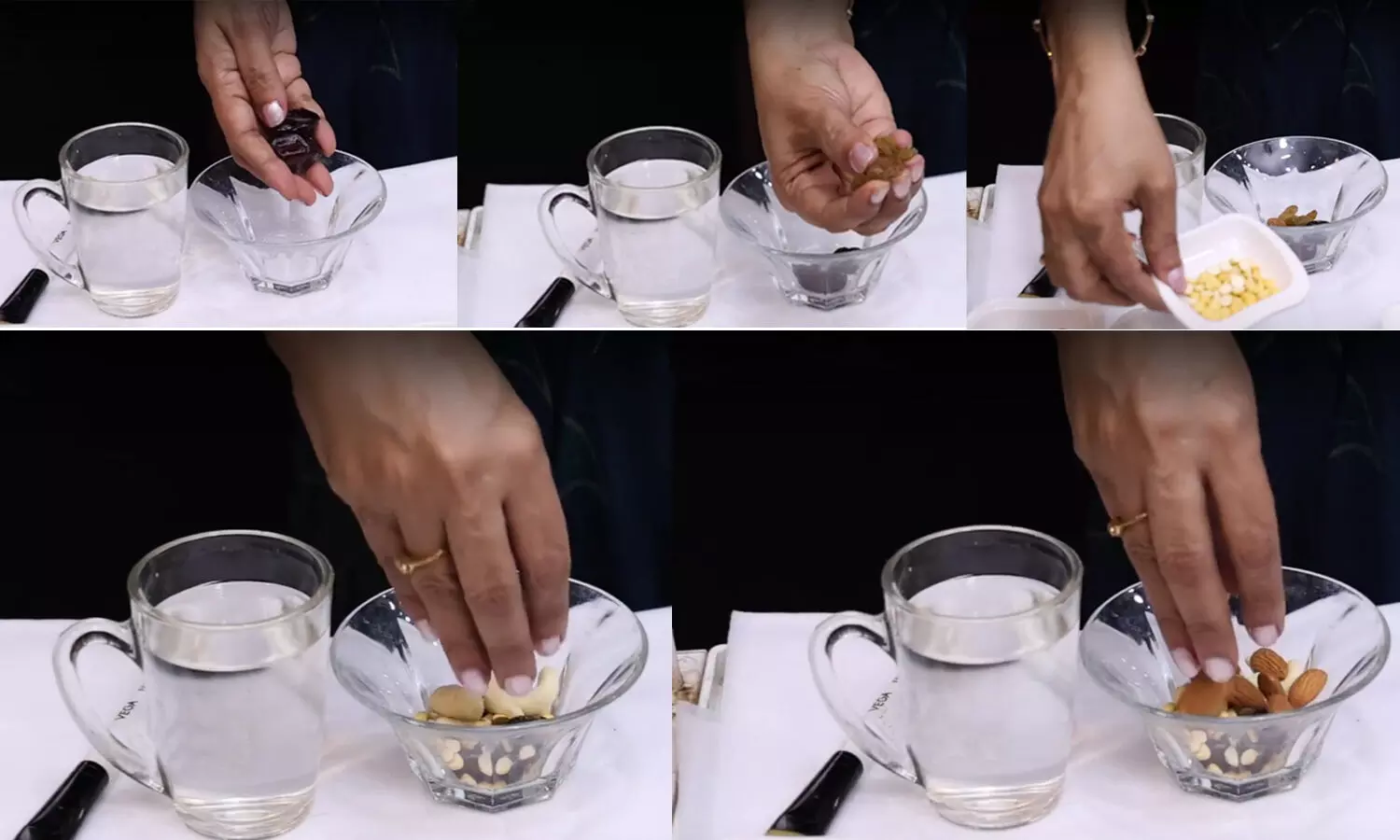 - முதலில் ஒரு சிறிய கிண்ணத்தில் 2 அல்லது 3 பேரீட்சை, 1 டீஸ்பூன் உலர்ந்த திராட்சை, 1 டீஸ்பூன் பொட்டுக்கடலை, 4 - 5 முந்திரி, 4 - 5 பாதாம் ஒன்றாக சேர்த்து அவை மூழ்கும் அளவுக்கு சுடு தண்ணீர் ஊற்றி சுமார் 2 மணி நேரம் ஊறவைக்க வேண்டும். ஊறவைத்த டிரை ஃப்ரூட்ஸை நன்கு பேஸ்ட் போல் அரைத்துக்கொள்ள வேண்டும்.