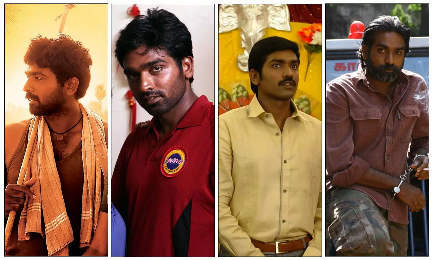 தமிழ் சினிமாவை பொறுத்தவரை அதிக கெட்டப்புகள் போட்டு நடித்த நடிகர் என்று சொன்னாலே, முதலில் நினைவுக்கு வரக்கூடிய நபர் நிச்சயம் உலகநாயகன் கமல்ஹாசனாகத் தான் இருக்க முடியும். குள்ளமாக வரும் அப்பு கதாபாத்திரம் துவங்கி பெண் வேடம், வயதான கிழவன் தோற்றம் என பல கெட்டப்புகளில் தோன்றி நடித்துள்ள கமல், உச்சபட்சமாக 'தசாவதாரம்' திரைப்படத்தில் பிரம்மிக்க வைக்கும் விதமாக 10 விதமான கெட்டப்புகள் போட்டு அசத்தியிருப்பார். இவரை போலவே நடிகர் திலகம் சிவாஜி கணேசனும் 'நவராத்திரி' திரைப்படத்தில் ஒன்பது கெட்டப்புகள் போட்டு கலக்கியதோடு, இவர் போடாத வேடங்களே இல்லை எனும் அளவிற்கு பல அற்புதமான கதாபாத்திரங்களை ஏற்று நடித்து, நம் உள்ளங்களில் இன்றும் வாழ்ந்து வருகிறார். இவர்கள் தவிர அந்தந்த காலத்திற்கு ஏற்றார் போல் அறிமுகமாகும் புது புது நடிகர்கள் 'கெட்டப் சேஞ்ச்' செய்து பல படங்களில் நடித்திருந்தாலும், 90-களின் துவக்கத்தில் சத்யராஜ், பிறகு அஜித், சூர்யா, விக்ரம் போன்ற நடிகர்கள் கூடுதல் கவனம் பெற்றனர். அந்த வரிசையில் தற்போது, இந்த 'கெட்டப் சேஞ்ச்' என்ற வார்த்தைக்கு அர்த்தமாக ஒரு நடிகர் சமீபகாலமாக இருக்கிறார் என்றால் அது விஜய் சேதுபதி தான். இந்த தொகுப்பில் இதுவரை நடிகர் விஜய் சேதுபதி ஏற்று நடித்துள்ள கதாபாத்திரங்கள் குறித்தும், அதற்காக அவர் செய்த கெட்டப் சேஞ்ச்கள் குறித்து காணலாம்.