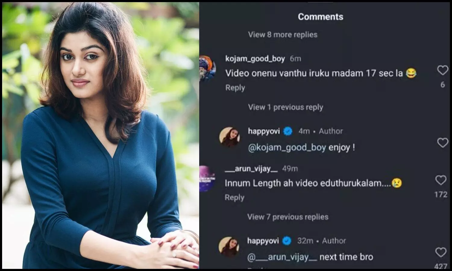 கிட்டத்தட்ட 2 வருடங்களாக எந்த மொழி திரைப்படங்களிலும் தலைகாட்டாத ஓவியா குறித்த செய்திகள்தான் தற்போது காட்டுத்தீபோல பரவிவருகின்றன. பொதுவாக நடிகர் நடிகைகளின் அந்தரங்க வீடியோக்கள் மற்றும் புகைப்படங்கள் வெளியே கசிந்துவிட்டால், அது நான் இல்லவே இல்லை என்று கூறுவார்கள் அல்லது எதுவும் பேசாமல் அமைதியாக இருப்பார்கள். ஆனால், ஓவியாவோ இந்த சூழ்நிலையை மிகவும் துணிச்சலாக நிதானத்துடன் கையாண்டு வருகிறார். அக்டோபர் 12ஆம் தேதி ஓவியாவின் அந்தரங்க வீடியோ என்ற பெயரில் 17 நொடி வீடியோ ஒன்று இணையத்தில் வைரலானது. ஓவியா தனது இன்ஸ்டாகிராமில் பகிர்ந்த புகைப்படத்துக்கு கமெண்ட் செய்த ஒருவர், ‘17 நொடிகளுக்கு வீடியோ ஒன்று வந்துள்ளது’ என கமெண்ட் செய்ய, சற்றும் எதிர்பாராதவிதமாக ‘என்ஜாய்’ என தக் ரிப்ளை கொடுத்தார் ஓவியா. அடுத்து ஒருவர், வீடியோவின் நீளம் குறைவாக உள்ளது. அதிக நீளமுள்ள வீடியோ கிடைக்குமா என கேட்க, ‘அடுத்தமுறை ப்ரோ’ என கமெண்ட் செய்தார். மற்றொருவர் இதுகுறித்து கேட்க, ‘அந்த லிங்கை எனக்கும் அனுப்புங்கள்’ என்று கேட்டுள்ளார்.