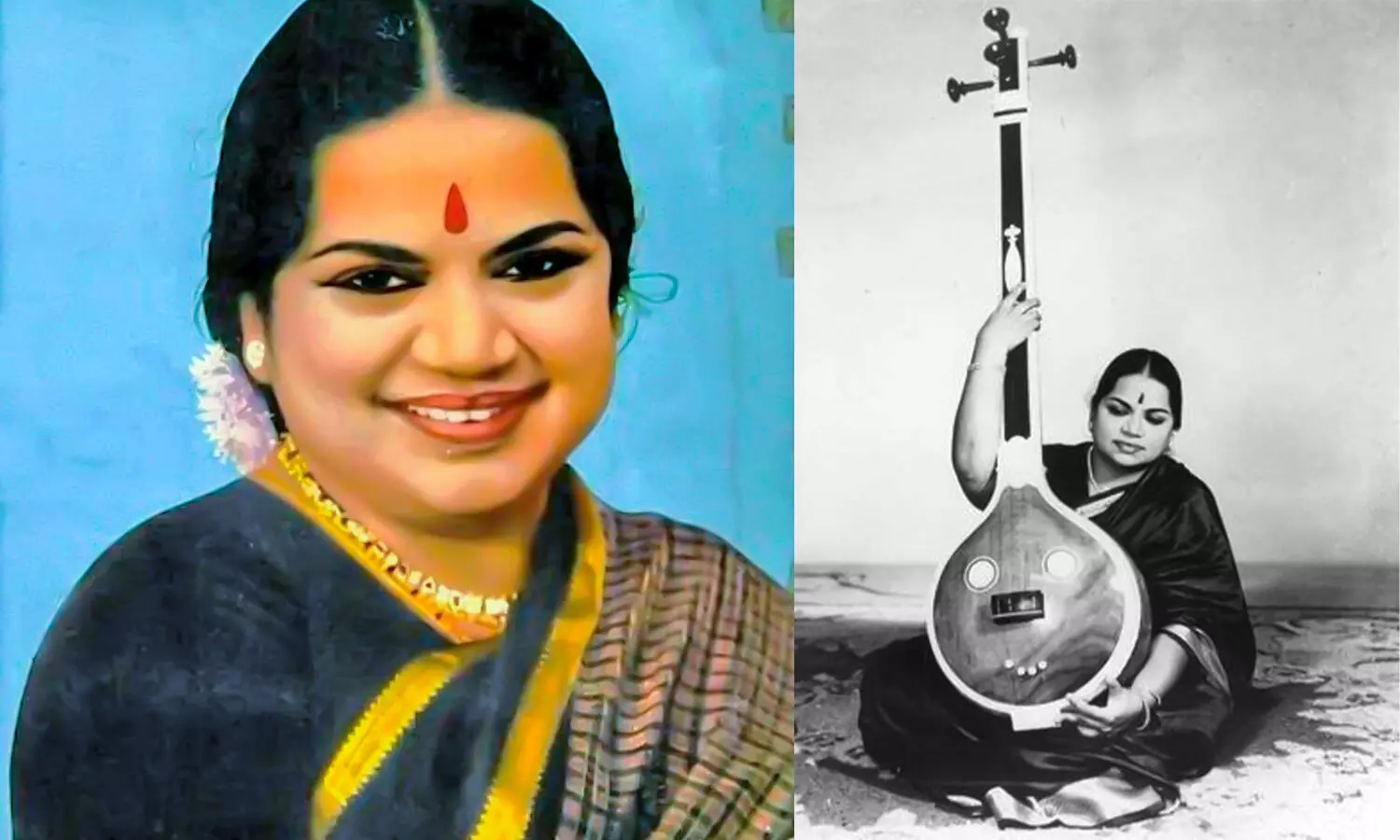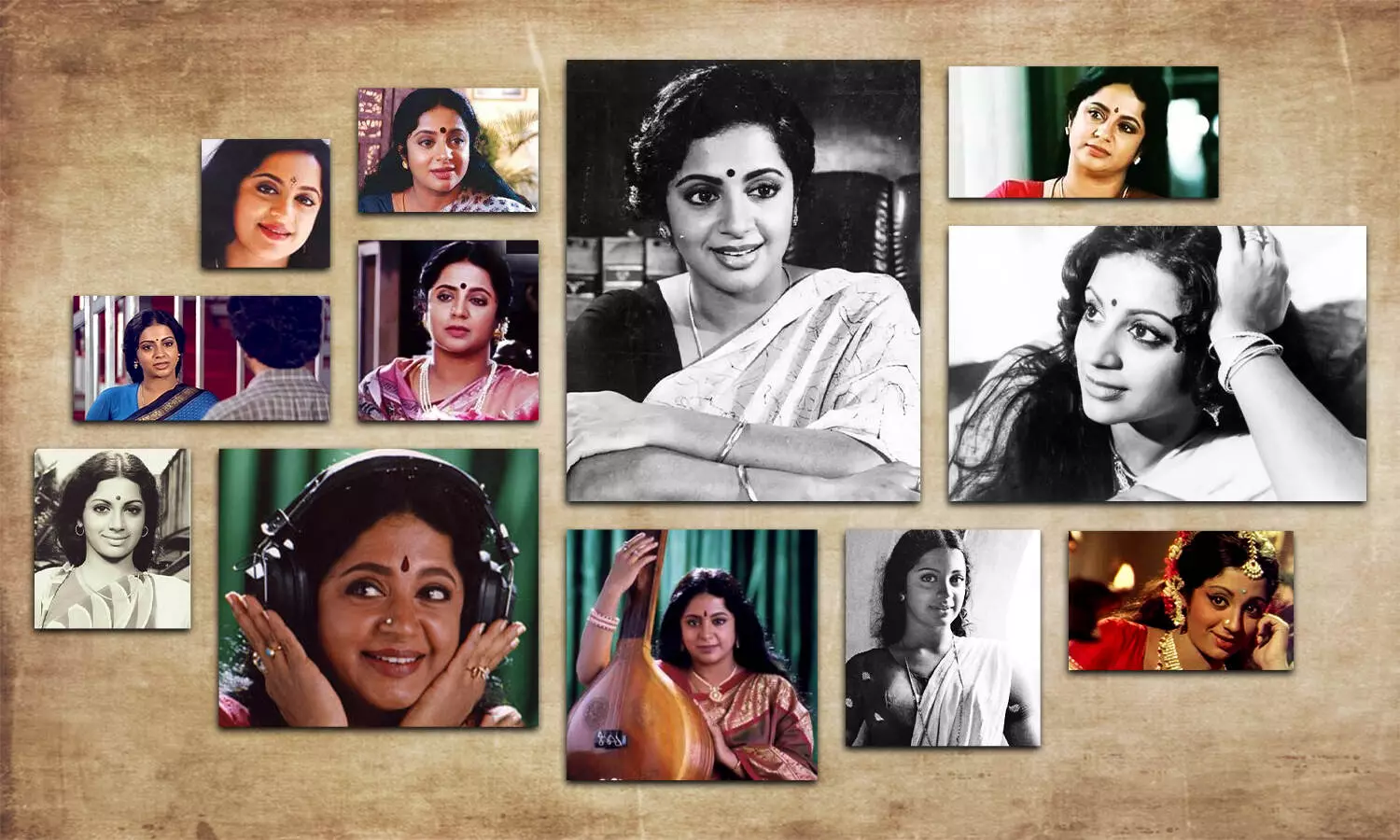 வீணை மற்றும் அழகான புன்னகையோடு காட்சியளிக்கும் இருவேறு தோற்றங்களில் ஸ்ரீவித்யா