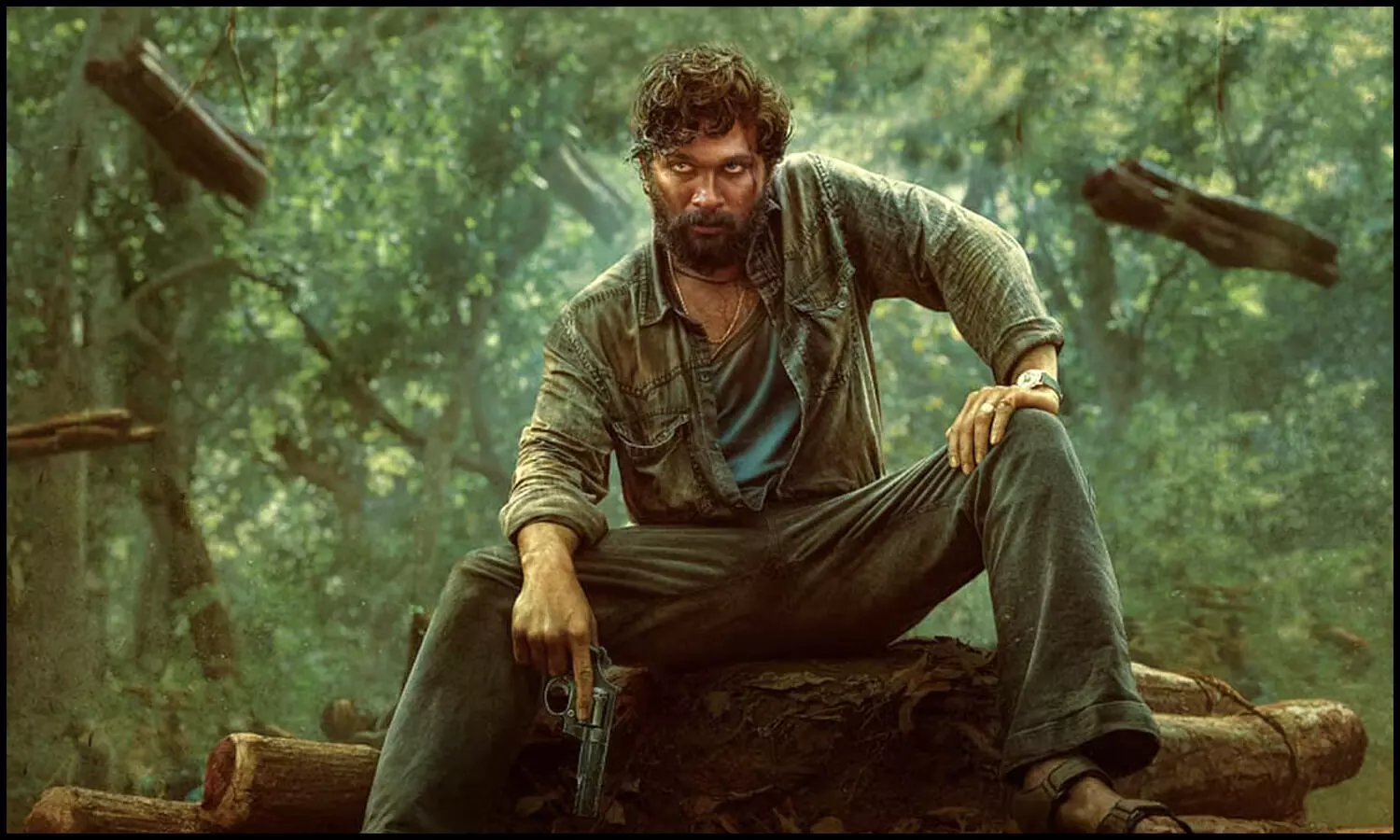 புஷ்பா; தி ரைஸ் திரைப்படத்தில் துப்பாக்கியுடன் அமர்ந்திருக்கும் அல்லு அர்ஜுன்