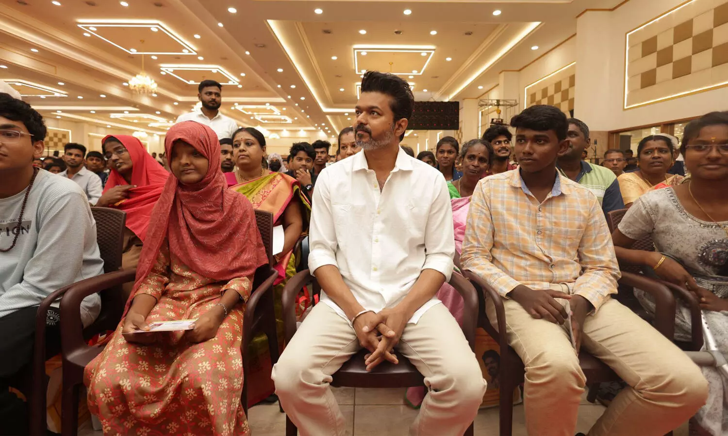 பாராட்டு விழா நிகழ்ச்சியில் மாணவர்களுடன் அமர்ந்துள்ள விஜய்