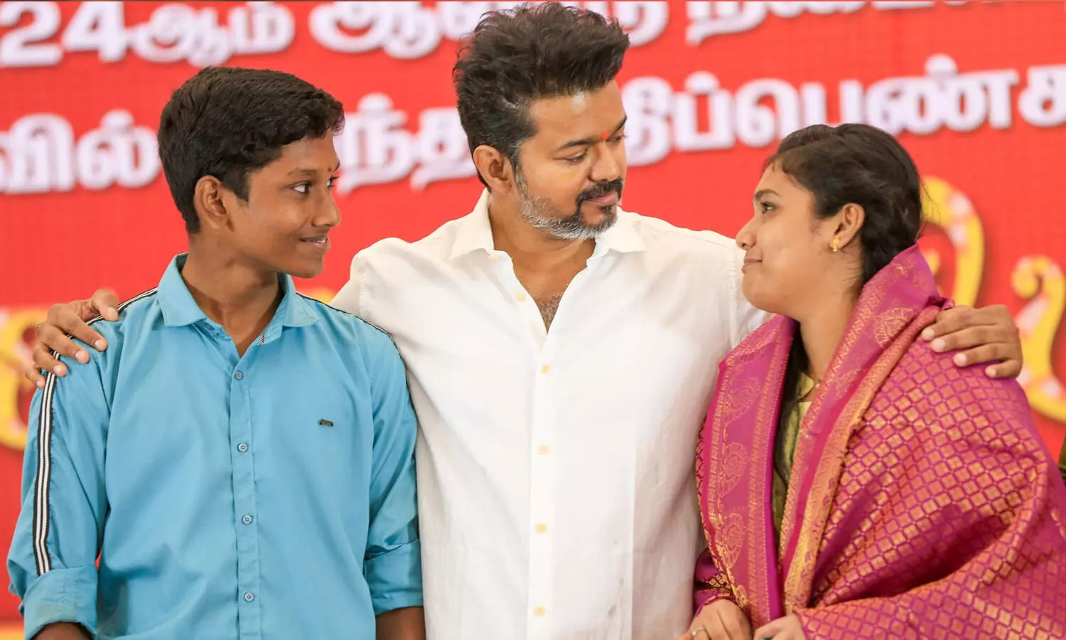 மாணவர்களுக்கு விருது வழங்குவதற்காக சரியாக 10 மணிக்கு விழா நடைபெறும் இடத்துக்கு வந்தார், நடிகரும் தமிழக வெற்றிக் கழகத் தலைவருமான விஜய். தொடர்ந்து மாணவர்கள் உடன் அமர்ந்து புகைப்படம் எடுத்துக் கொண்டார். முதல் ஆளாக நாங்குநேரியில் சாதிய ஆதிக்க தாக்குதலுக்கு உள்ளான மாணவன் சின்னதுரையுடன் அமர்ந்து விஜய் புகைப்படம் எடுத்துக் கொண்டார்.