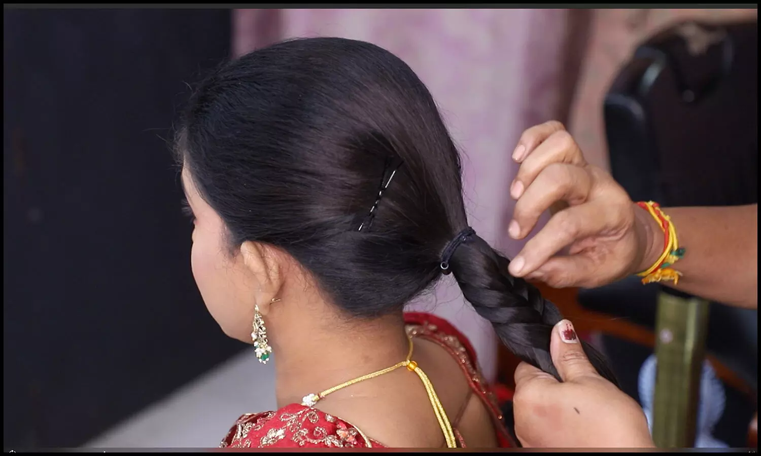பின்னல்களுக்கு நடுவே இரண்டு ரப்பர் பேண்டுகளை இடைவெளி விட்டு போடுதல்