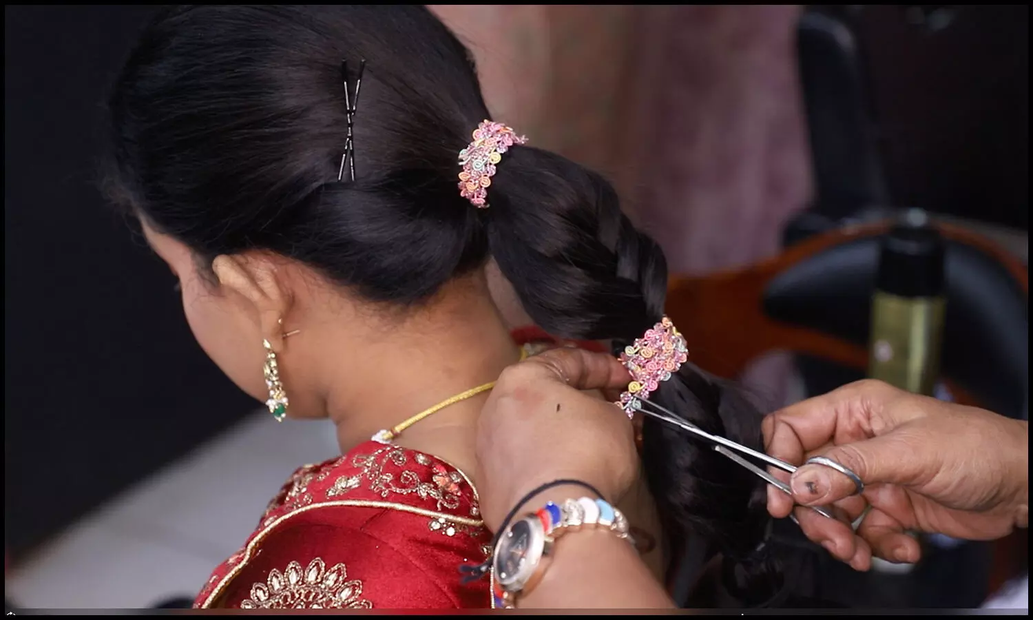 நீளமான பின்னலின்மீது பூ அலங்காரம் செய்வது பலருக்கும் பிடிக்கும். ஆனால் அதுவே திருமணத்தின்போது பாரம்பரிய முறைப்படி ஹேர்ஸ்டைல் செய்ய ஆசைப்படும் பெண்கள் பலர், ரிசப்ஷனின் போது மாடர்னாக டிரெண்டிங்காக இருக்க நினைப்பார்கள். அதற்கு சிம்பிளாக அதேசமயம் வித்தியாசமான ஹேர் ஸ்டைல் போடவேண்டுமென கேட்கும் பெண்களுக்கென்றே பஃப் வைத்து போனிடெய்ல் போடுவது, கர்ளிங் செய்வது, எக்ஸ்டன்ஷன் பொருத்தி க்ளிப்ஸ் போடுவது, பல ஜடைகள் போட்டு அவற்றை ஒன்றாக்கி அலங்கரிப்பது என பல ஹேர் ஸ்டைல்கள் செய்யப்படுகின்றன. ஆனால் அதுபோன்ற ஹேர்ஸ்டைல்களை செய்ய அதிக நேரம் தேவைப்படும். அவர்களுக்காகவே பிரத்யேகமாக சிம்பிள், அதேசமயம் வித்தியாசமான ஹேர்ஸ்டைல் ஒன்றை செய்துகாட்டுகிறார் அழகுக்கலை நிபுணர் லலிதா. குறிப்பாக ரிசப்ஷனுக்கு போடக்கூடிய டிரெண்டியான ஹேர்ஸ்டைல் இது என்கிறார். இந்த ஹேர்ஸ்டைலை ஷார்ட்டான முடியிலும் போட முடியும், நீளமான முடியிலும் போடமுடியும் என்பதால் முடியின் நீளம் குறித்தெல்லாம் மணப்பெண் கவலைப்பட தேவையில்லை என்கிறார் அவர்.