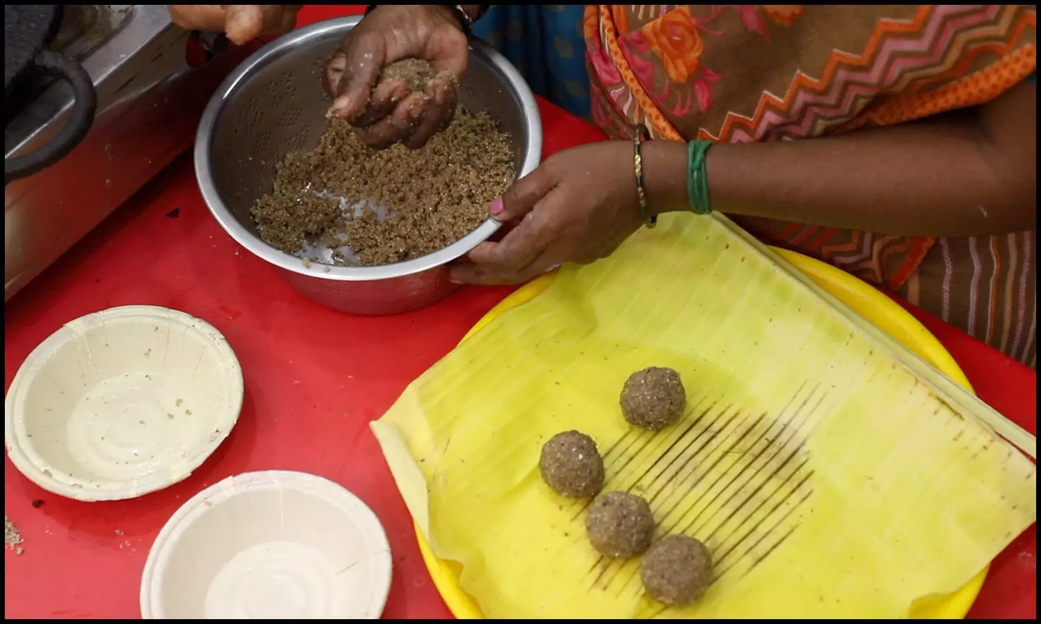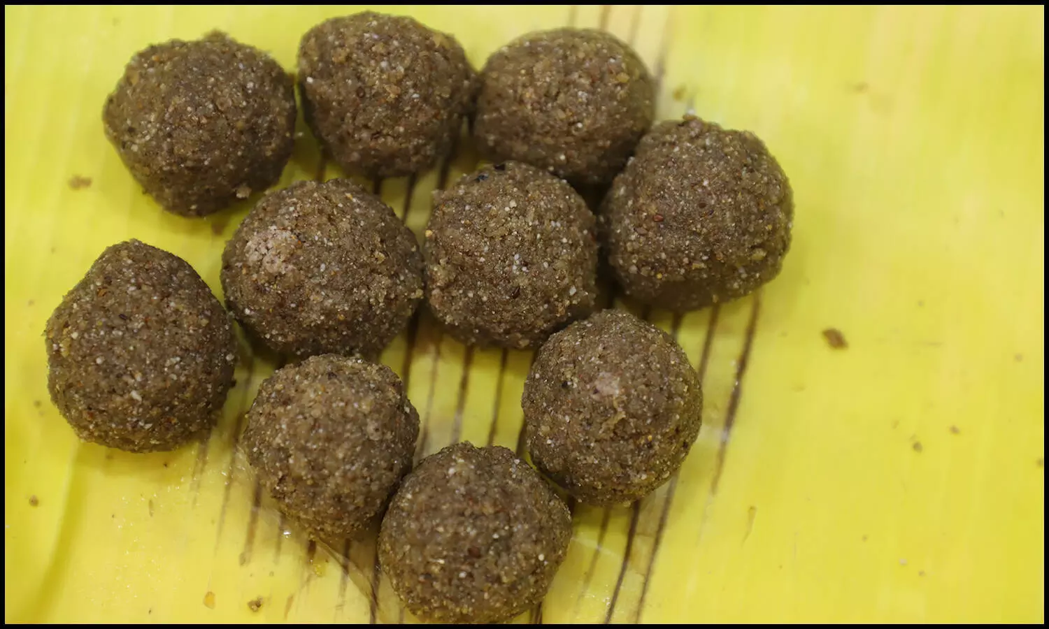 கம்பு அடையை தூளாக்கி வேர்க்கடலை, எள்ளு சேர்த்து உருண்டைகளாக பிடிக்க வேண்டும்