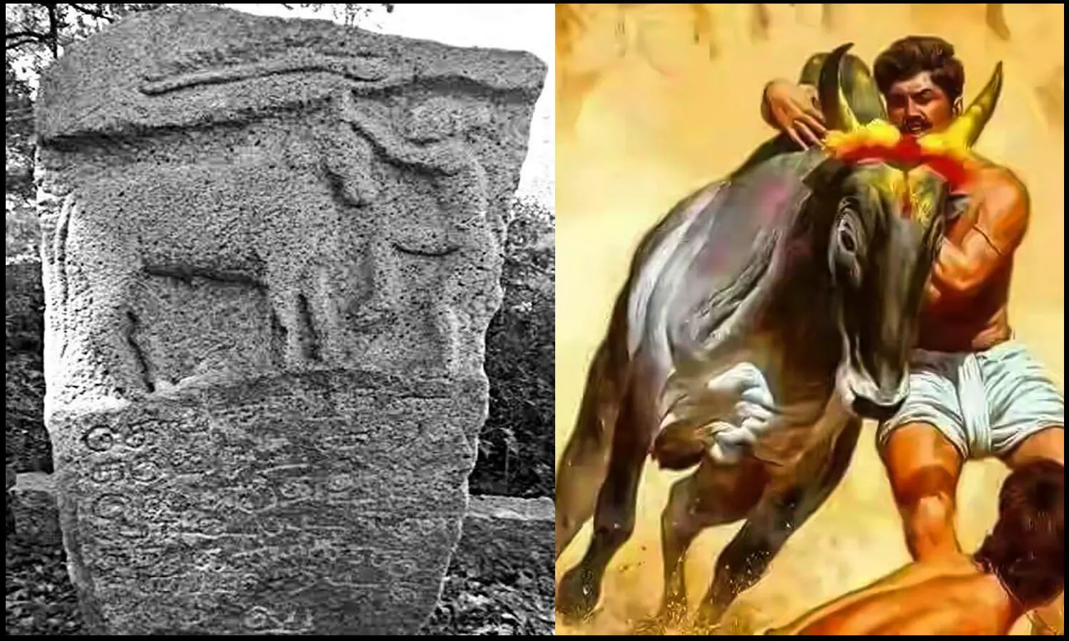 ஏறுதழுவுதலை உறுதிப்படுத்தும் கல்வெட்டு மற்றும் காளையுடன் மோதும் இளைஞரின் புகைப்படம்