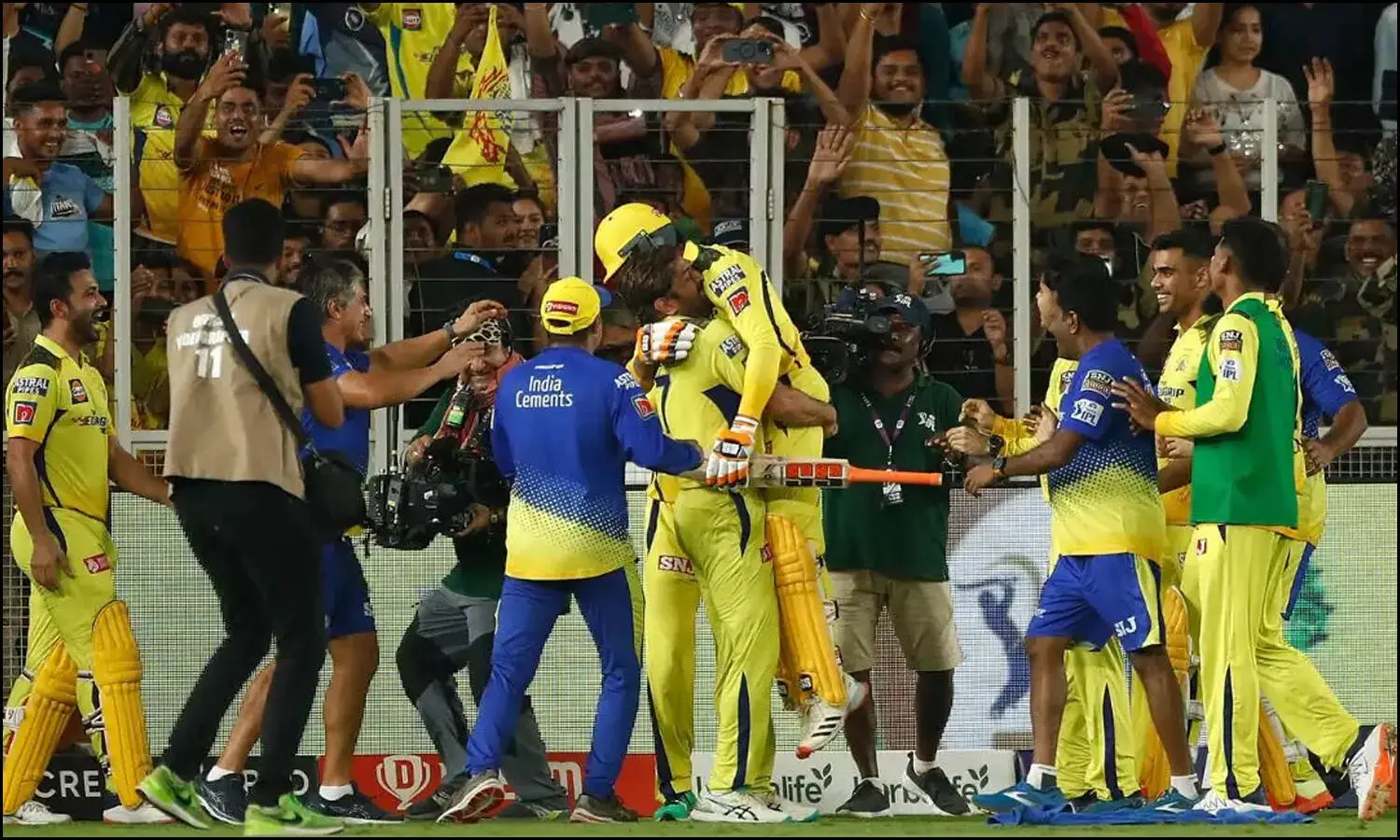 2023 ஐபிஎல் போட்டியில் சென்னை வெற்றிபெற்ற போது ஜடேஜாவை தூக்கிக் கொண்டாடிய தோனி